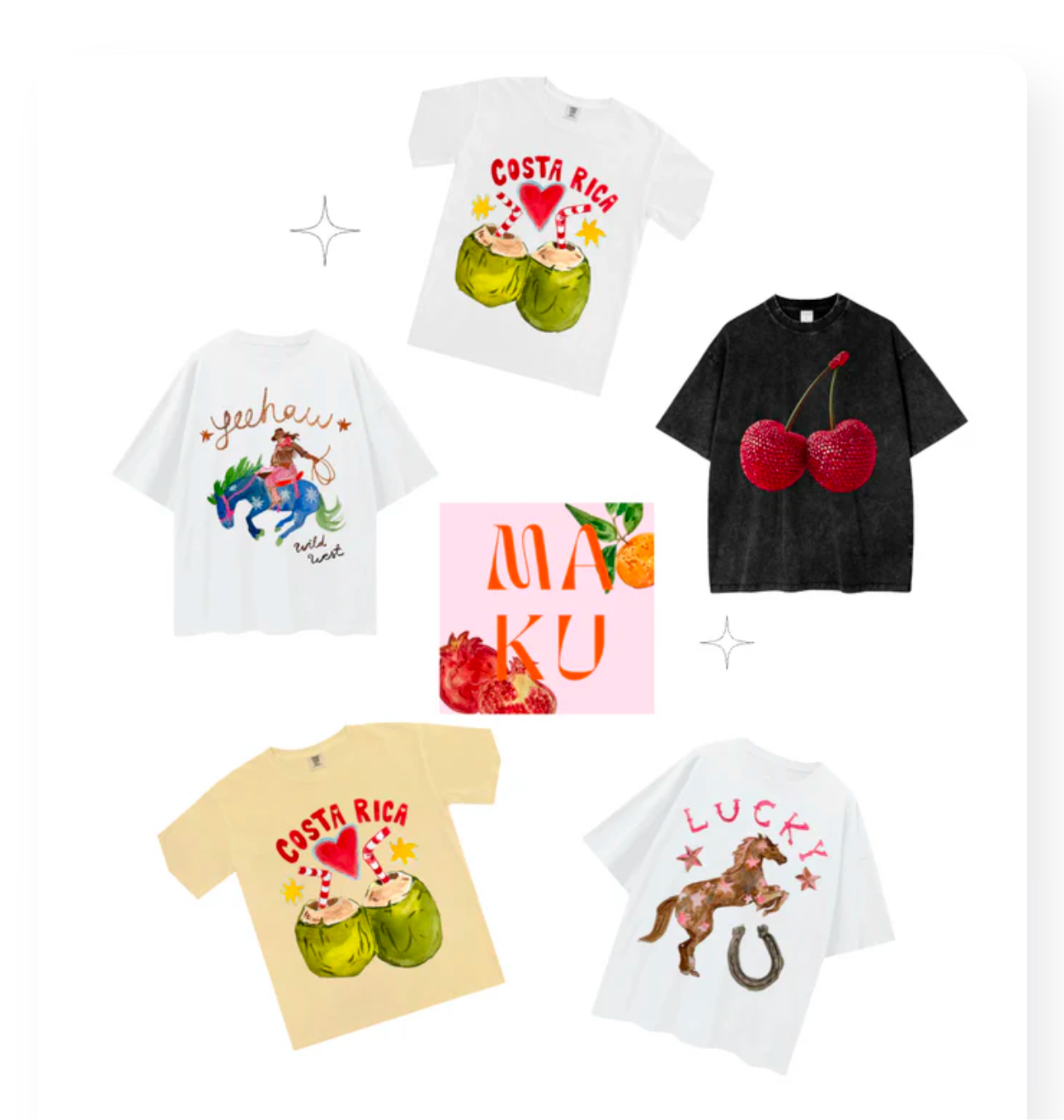 The beautifully talented Maku at it again. Costa Rica bringing all the tropical and summery vibes. Brighten your wardrobe with this cute tee.